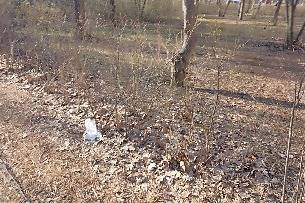 Сквер на Малой земле относится к Северному округу. Никаких работ по уборке территории не проводилось. Кусты и деревья утопают в прошлогодней листве и мусоре.