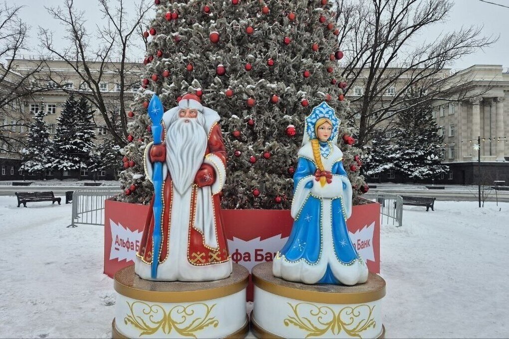 В Оренбурге у главной городской елки появились долгожданные сказочные гости. В сквере у Дома Советов, рядом с 12-метровой праздничной елью, установили фигуры Деда Мороза и Снегурочки.