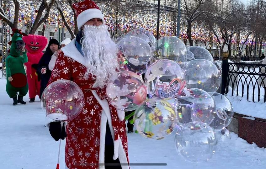 Обязательным пунктом программы для гостей были фотографии в сияющем тоннеле с цифрами «2026» и под гирляндами, имитирующими звёздное небо. Вечером 31 декабря на большом экране проходил марафон популярных мультфильмов для всей семьи.