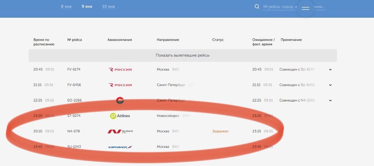 Новое время вылета: 23:25 (задержка +3 часа 15 минут).